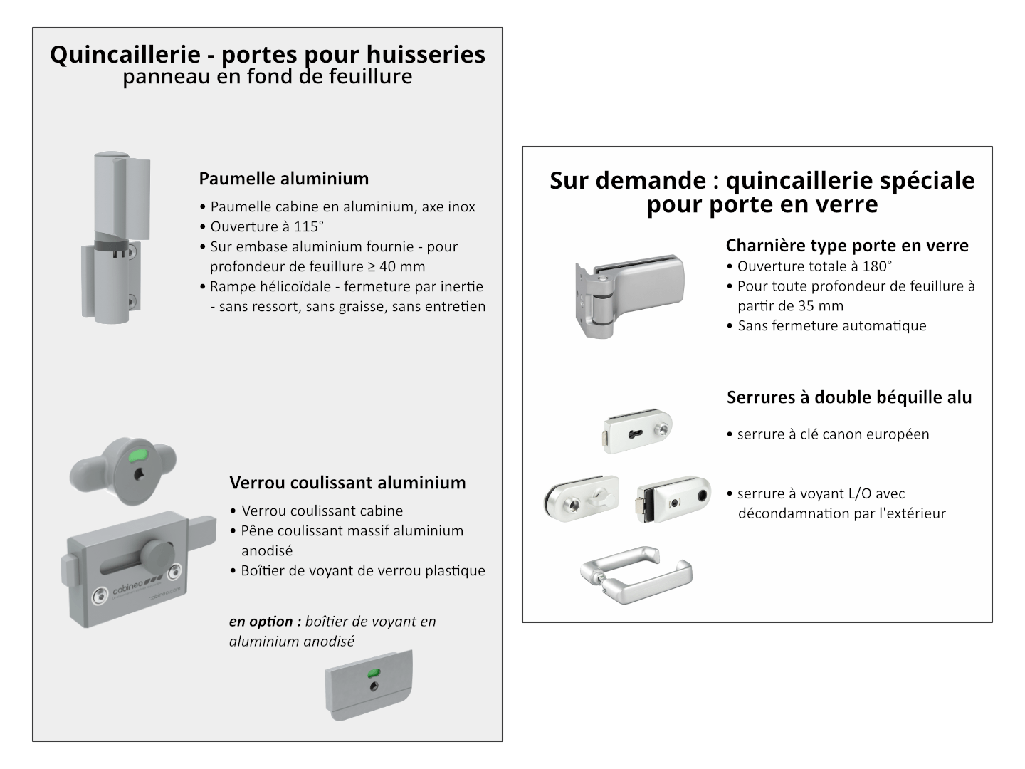 | Paumelles cabine | alu anodisé | avec axe inox – dégondable ou non (choix à la pose) |